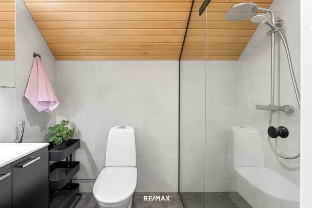 - Alakerrassa kylpyhuone, jonka yhteydessä kodinhoitohuone: pesukoneliitäntä, allas, allaskaapisto, pyykkikaappi, pyyhekuivain (sähkö), sadesuihku, suihkuseinä. Yläkerrassa kylpyhuone, jossa peilikaappi, allaskaappi, wc-istuin, kokolasinen suihkuseinä. Kylpyhuoneiden seinät ja lattia laattaa, vesikiertoinen lattialämmitys.