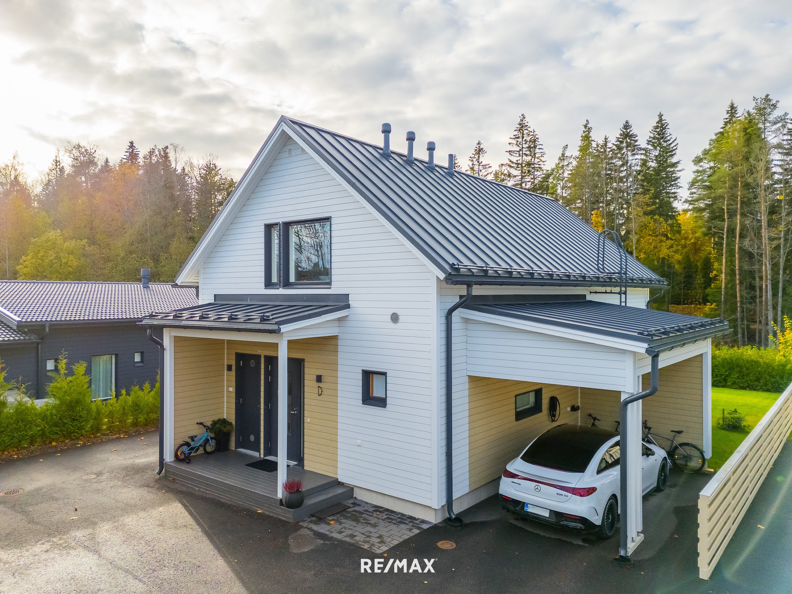 Asuntoon kuuluu autokatos, jossa on sähköauton latausasema, pihalle mahtuu jopa kolme autoa tai venetraileri. Piha-alue on suojaisa ja helppohoitoinen, mainio pohja oman kesäkeitaan suunnitteluun ja toteutukseen.