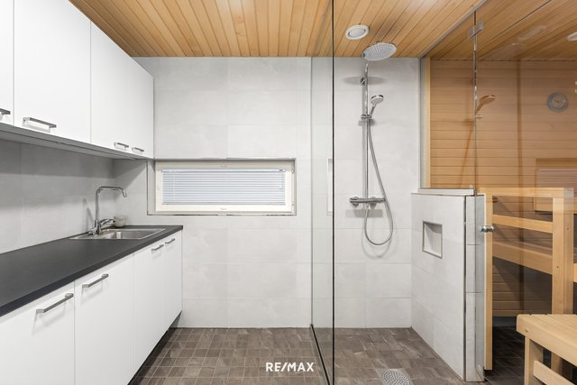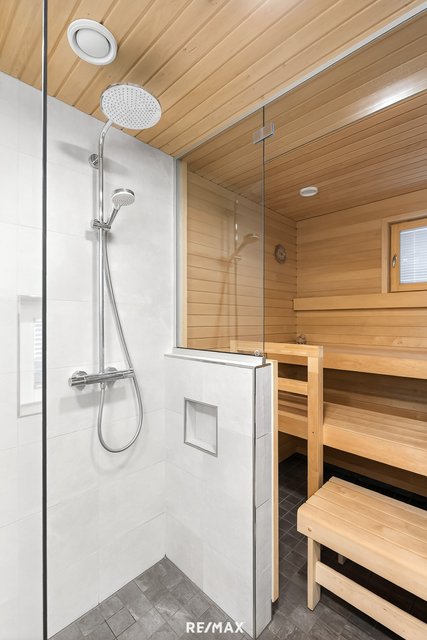Kylpyhuoneet ovat ajattomat, lattialämmitys ja modernit materiaalit viimeistelevät kokonaisuuden. Alakerran kylpyhuoneen yhteydessä on kodinhoitohuone helpottamassa arjen askareita. Saunassa on puoli-lasiseinät ja Harvian pylväs-kiuas. Asunnossa on miellyttävä vesikiertoinen lattialämmitys.