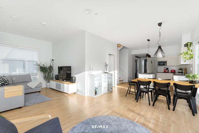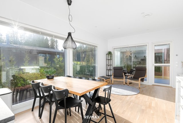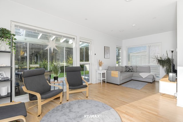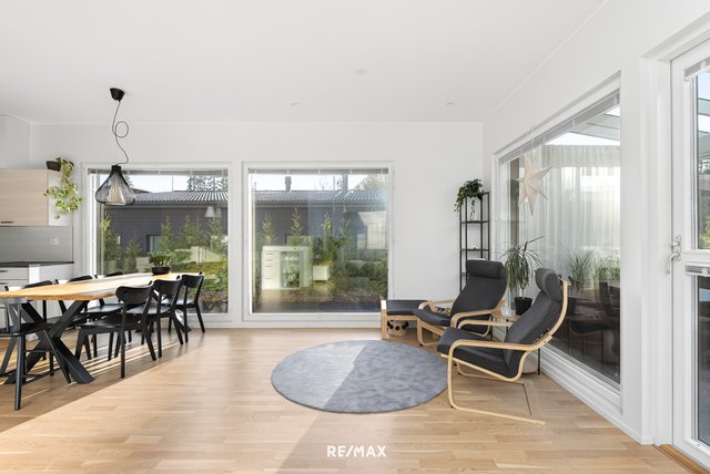 Valoisassa olohuoneessa on suuret ikkunat kahteen ilmansuuntaan ja näkymät aukeavat omalle piha-alueelle sekä läheiseen metsään. Olohuone on laajennettu poistamalla seinä viereiseen makuuhuoneeseen ja näin on saatu tilava oleskelualue perheen yhteisiin hetkiin. Olohuoneesta on käynti lasitetulle terassille ja länteen suuntautuvalle takapihalle. Olohuoneessa on takkavaraus, joka tarjoaa mahdollisuuden lisätä kodikkuutta. Opdeco-keittiö on varustettu laadukkailla AEG-kodinkoneilla ja saarekkeella, joka tekee ruoanlaitosta nautinnon.
