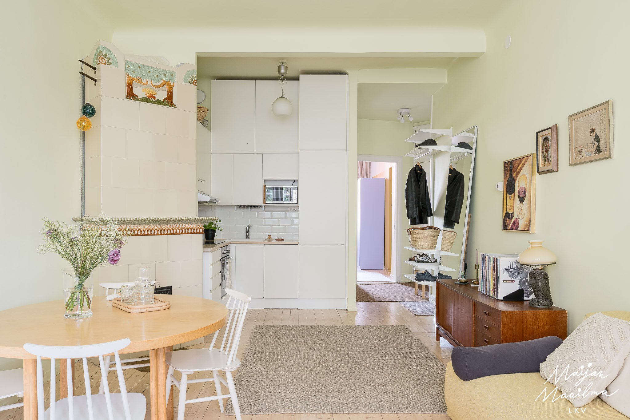 Tarjolla läpitalonhuoneisto Kallion yhdestä upeimmasta talokaunottaresta. Rauhallisen asunnon keskiön luovat olohuoneen ja avokeittiön muodostama avara kokonaisuus. Keittiön valkoiset mittatilauskaapistot ovat ajattomat, säilytys- ja laskutilaa on mukavasti. Olohuoneen kaakeliuuni tuo tunnelmaa. Asunnon juuri remontoitu kylpyhuone/wc hohkaa uutuuttaan ja on remontoitu talon hengen mukaisesti. Makuuhuoneen ikkunat aukeavat sisäpihalle, olohuone-keittiön ikkunat suuntaavat puolestaan vehreään ja rauhalliseen Alli Tryggin puistoon. Kuumalla säällä puut pitävät asunnon viileänä ja talvella asunto tulvii valoa.