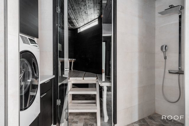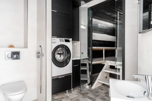 - WC-istuin, suihku, lattialämmitys, pesukoneliitäntä, pesukone, ja bidee-suihku