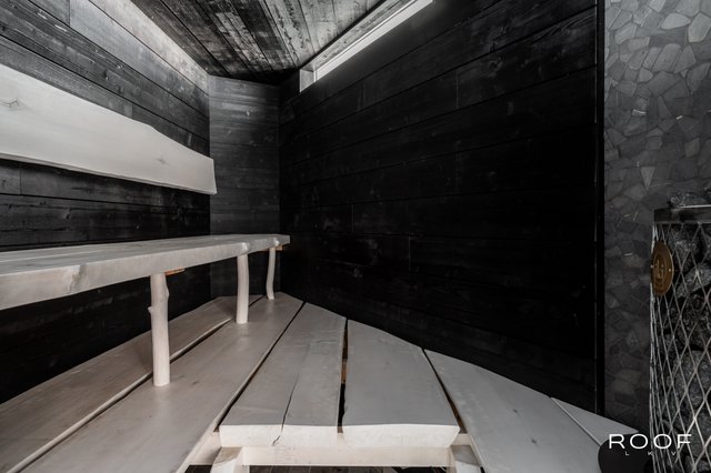 - Siparilan saunapaneeli seinissä ja katossa. Lauteet tuppeen sahattua haapaa, maalattu valkoiseksi.