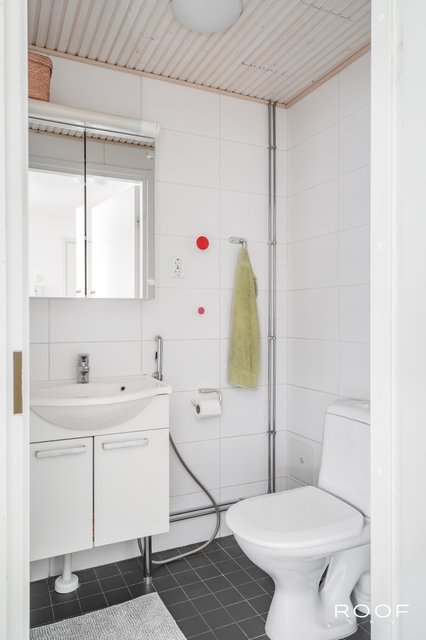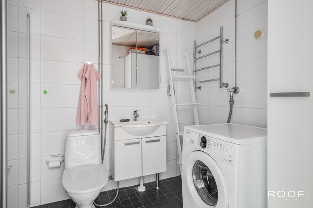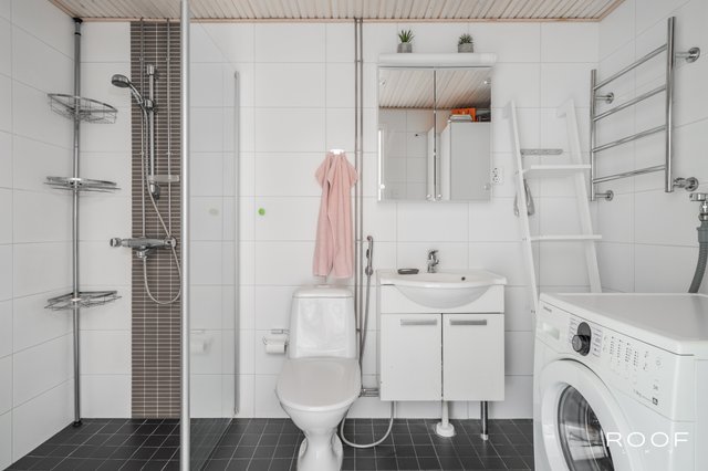 - Suihku, suihkuseinä, lattialämmitys, pesukoneliitäntä, peilikaappi, allaskaappi, wc-istuin, ja bidee-suihku