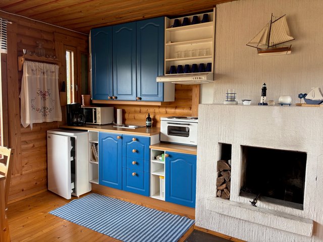 Keittiössä on kaikki tarpeellinen, kuten jääkaappi ja sähköliesi, ja puulämmitteinen sauna tarjoaa rentouttavat löylyt pitkän päivän päätteeksi.