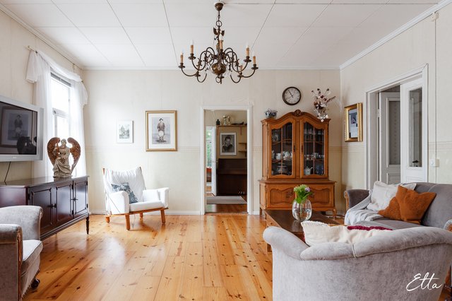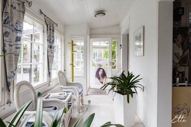 Asunnon sisätilat ovat avarat ja monipuoliset: alakerrassa olohuone yhdistyy sulavasti ruokailutilaan ja keittiöön, jonka lisäksi löytyy tilava makuuhuone sekä läpikuljettava huone esimerkiksi työ- tai vierashuoneeksi. Yläkerrassa sijaitsevat kaksi tilavaa makuuhuonetta, joista toisessa oma wc ja toisessa kylpyhuone, sekä suuri arkiolohuone. Kaunis veranta tuo lisää viihtyisää oleskelutilaa ympäri vuoden. Pihapiirissä on erillinen rakennus, joka toimii nykyisin parturi-kampaamona, mutta sopii hyvin myös muuhun yritystoimintaan. Lisäksi samassa rakennuksessa on saunatilat, autotalli ja varastotilaa. Vehreä puutarha istutuksineen kutsuu nauttimaan ulkoilmasta ja kokonsa puolesta se on täydellinen paikka viettää ystävien ja perheen kesken puutarhajuhlia.
