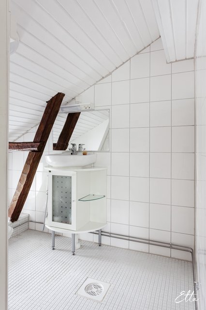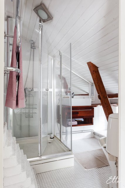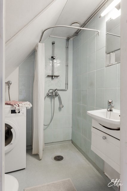 - WC-istuin, suihku, pesuallas, allaskaappi, peili, lattialämmitys yläkerran kylpyhuoneissa, ja suihkukaappi
