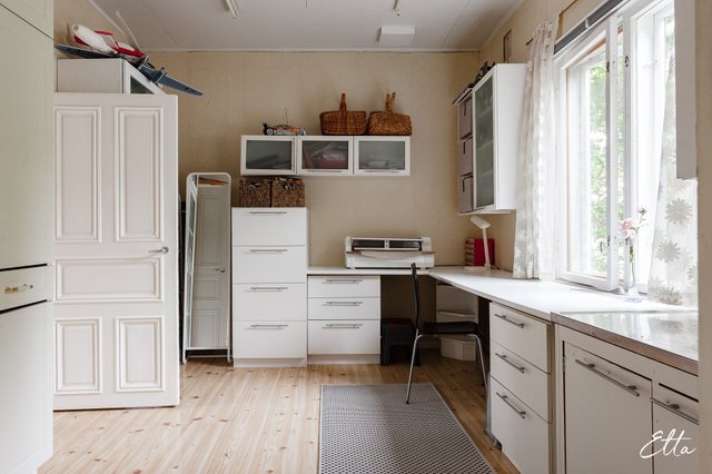 - Pesuallas, lattiakaivo, pöytätaso, pyykkikaapit, ja siivouskaappi