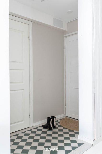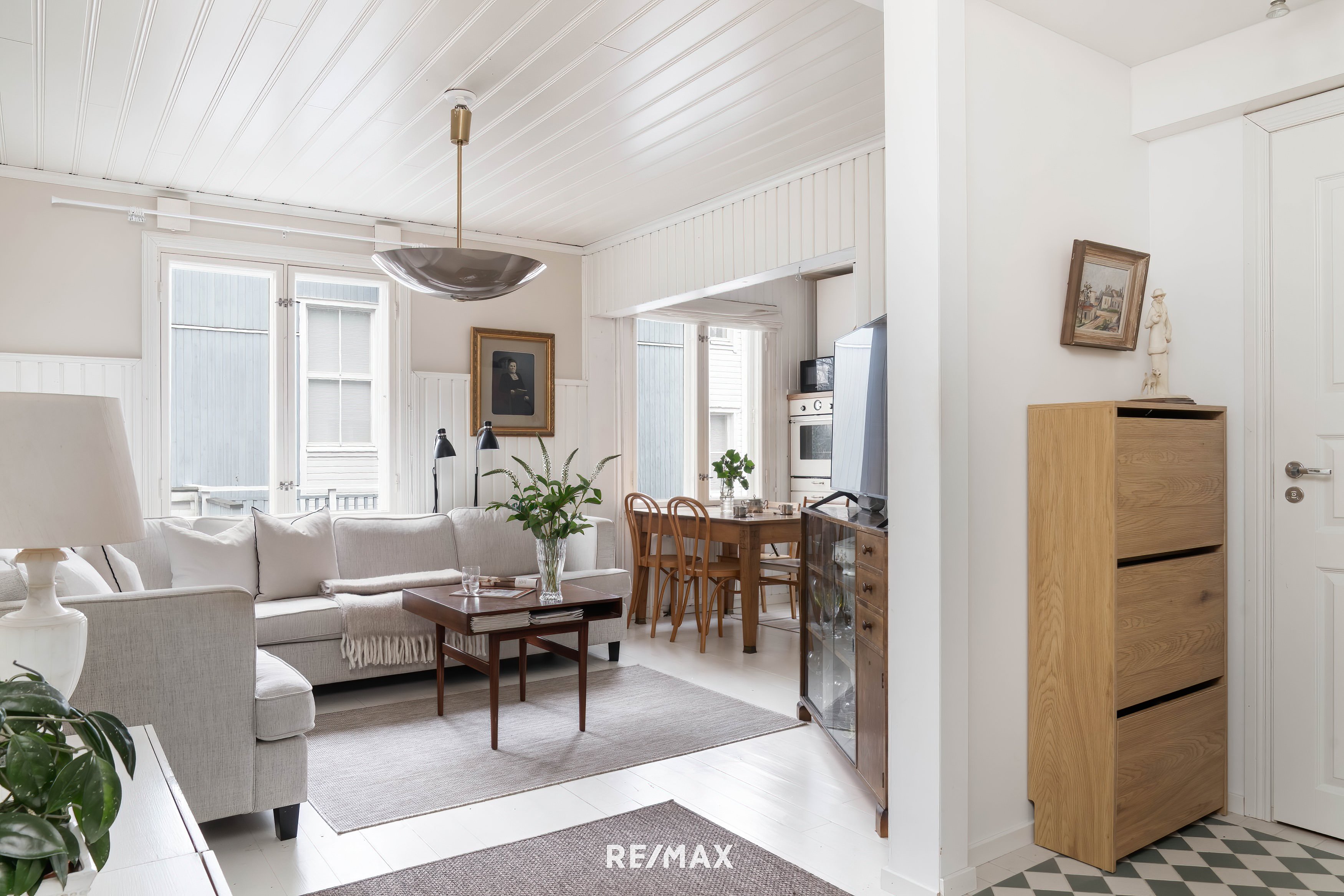 Huoneisto sijaitsee talon ensimmäisessä kerroksessa, mutta ei kuitenkaan maan tasalla. Pohjaratkaisu on toimiva ja selkeä. Olohuone ja avokeittiö muodostavat viihtyisän kokonaisuuden, jossa lautalattiat, puolipaneloidut seinät ja vaaleasävyiset pintamateriaalit luovat rauhallisen, kodikkaan ja harmonisen ilmeen. Keittiö on vaaleasävyinen ja varustettu pääosin integroiduilla kodinkoneilla, ja se istuu luontevasti osaksi asunnon sekä aikakauden henkeä.