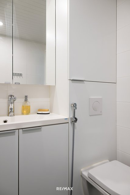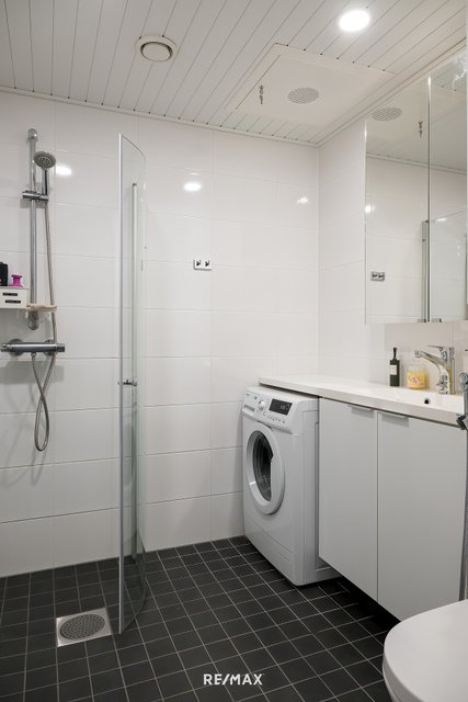 - WC-istuin, suihku, peilikaappi, peili, bidee-suihku, lattialämmitys, pesukoneliitäntä, ja suihkuseinä