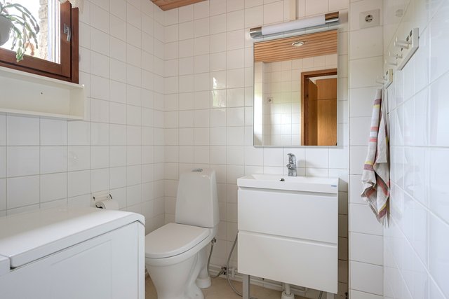 - -ENSIMMÄISEN KERROKSEN WC: pesukoneliitäntä, pesuallas, peili, allaslaatikosto, wc-istuin, bideesuihku, kokonaan laatoitettu, ikkunallinen