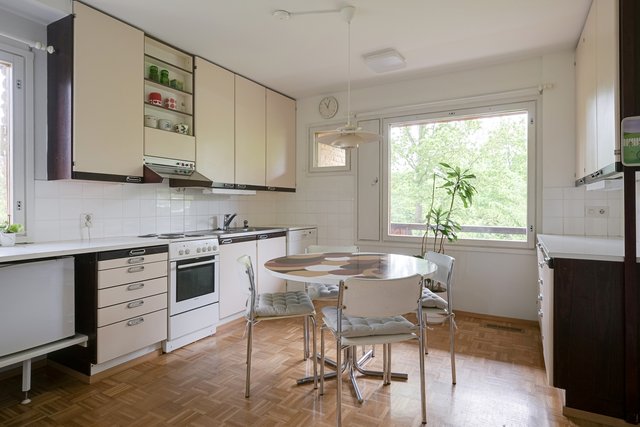 - Huurre-Kylmiö, astianpesukone (ei toimi), sähköliesi, liesituuletin hormiin, uuni, kaapistot, jääkaappi, välitila kaakeli, lattia parketti, seinät maali / kaakeli