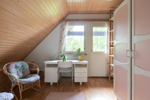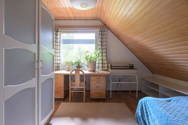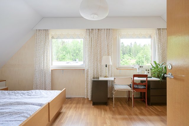 - -TOISEN KERROKSEN ISO MAKUUHUONE: kaappi, lattia parketti, seinät tapetti ja maali. Vaatehuone. -TOISEN KERROKSEN TOINEN MAKUUHUONE: kaappi, lattia parketti, seinät maali. Käynti parvekkeelle. -TOISEN KERROKSEN KOLMAS MAKUUHUONE: kaappi, lattia parketti, seinät maali -ENSIMMÄISEN KERROKSEN MAKUUHUONE: kaappi, pöytärakennelma vetolaatikkoineen ja hyllykköineen, lattia parketti, seinät maali