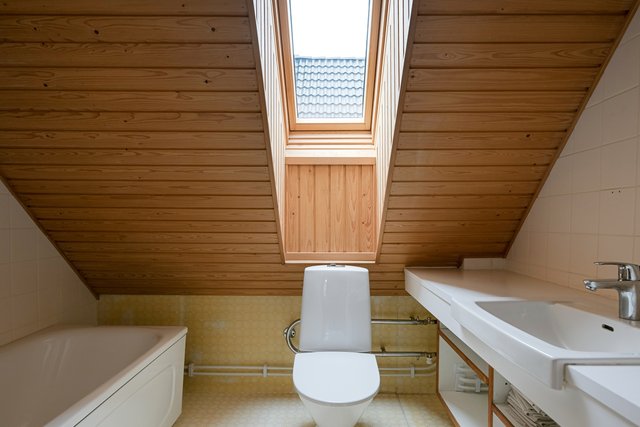 - -POHJAKERROKSEN KH: suihku, kokonaan laatoitettu, ikkunallinen -TOISEN KERROKSEN KH: kylpyamme, pesuallas, peili, allashyllykkö, wc-istuin, lattia muovi, seinät kaakeli ja paneeli. Ikkunallinen