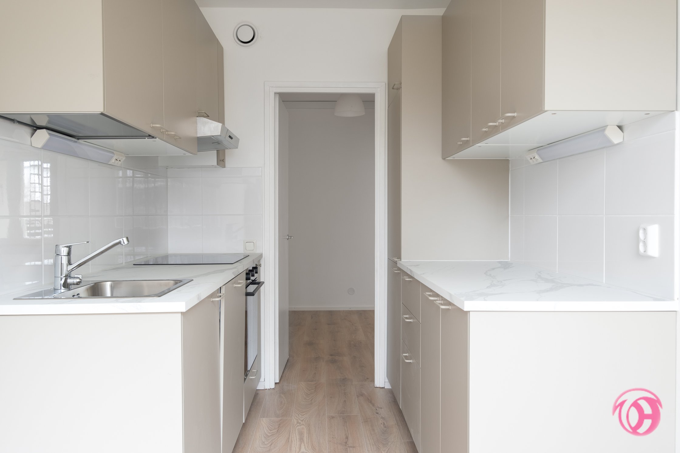 - Juuri uusittu keittiö kaapistoineen ja kodinkoneineen, hyvät säilytystilat ja työtasot. Samalla uusittiin seinä- ja lattiapinnat. Tilaan sopii hyvin ruokailuryhmä.