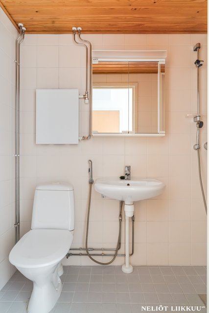 - WC-istuin, suihku, peilikaappi, pesuallas, bidee-suihku, pesukoneliitäntä, ja lattialämmitys