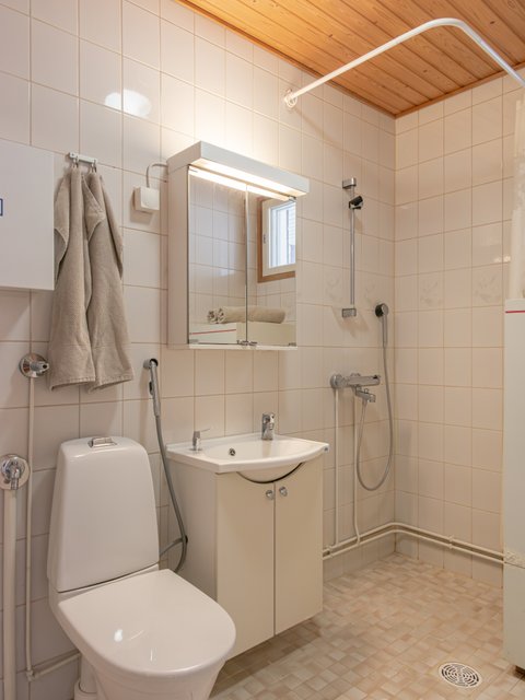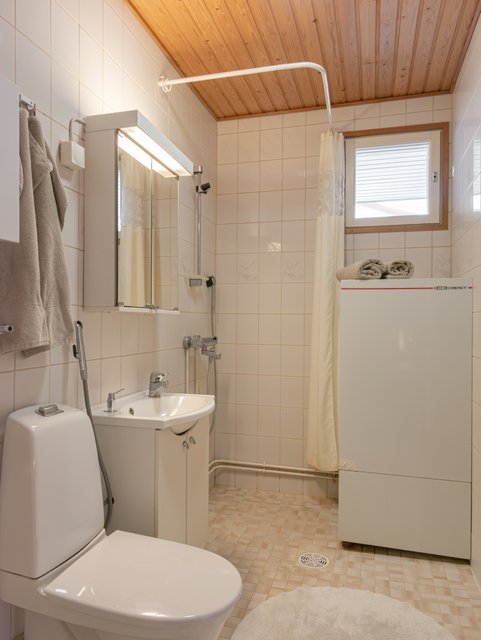 - WC-istuin, suihku, pesukoneliitäntä, lattialämmitys, peilikaappi, allaskaappi, ja bidee-suihku