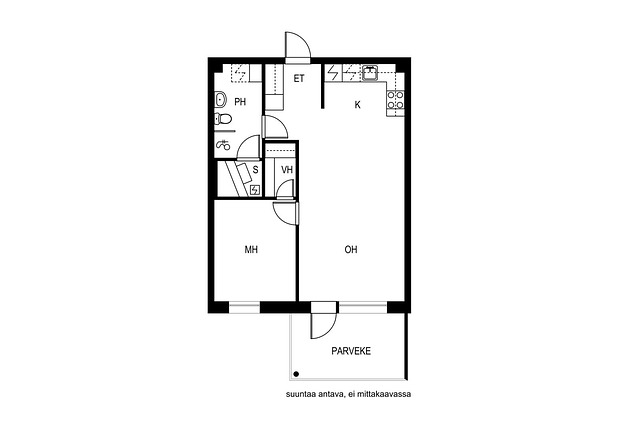 Laatoitettu eteinen, jossa kaapistojen lisäksi hyvin tilaa naulakoille tai lipastolle. Keittiö-olohuonetila on pitkien seinäpintojen ansiosta helposti kalustettavissa ja tilaan sopii reilun kokoiset sohvakalusteet sekä ruokailuryhmä. Lisätilaa asuntoon tuo lasitettu parveke.