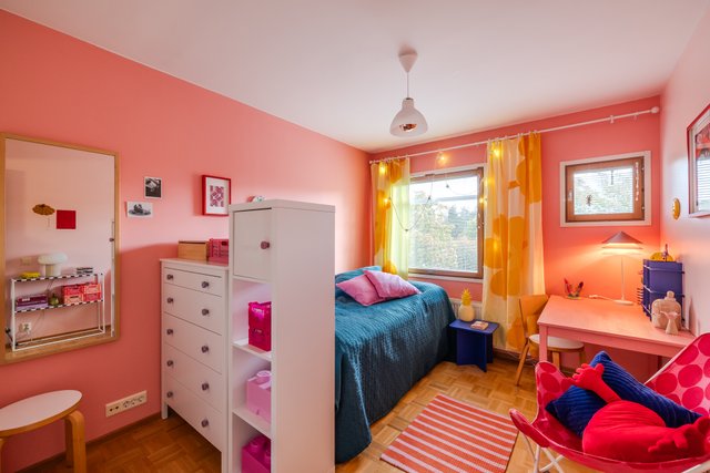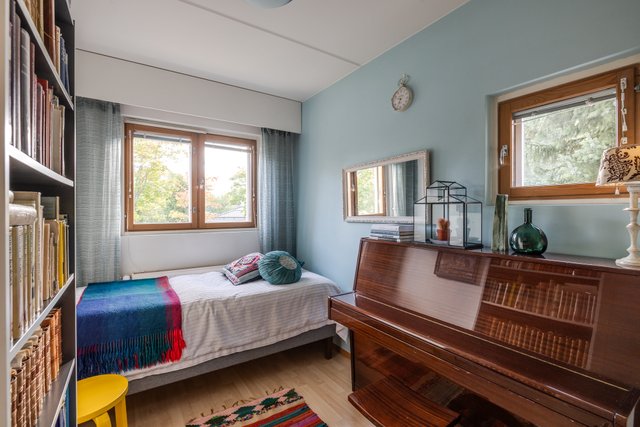 - Yläkerran makuuhuoneet, seinät maalattu, lattiat parkettia. Alakerran makuuhuone seinät maalattu, lattia laminaattia.