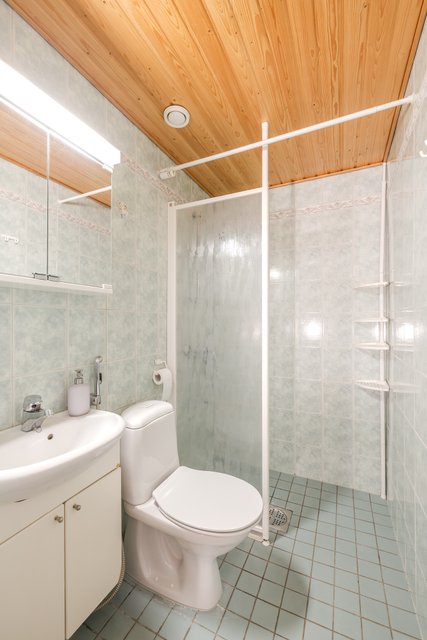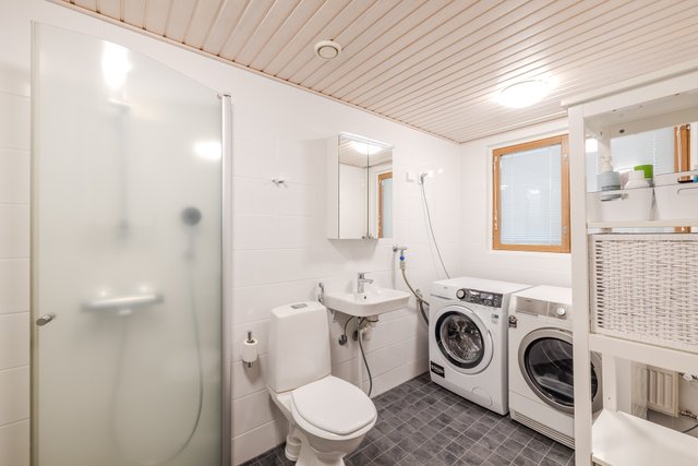 - Alakerrassa saunan yhteydessä ikkunallinen kylpyhuone, suihku, kääntyvät suihkuseinät, wc-istuin, peilikaappi, seinät laatoitettu, lattia laatoitettu, mukavuuslattialämmitys. Yläkerrassa kylpyhuone, suihku, suihkuseinä, peilikaappi, allaskaappi, wc-istuin, seinät laatoitettu, lattia laatoitettu, mukavuuslattialämmitys.