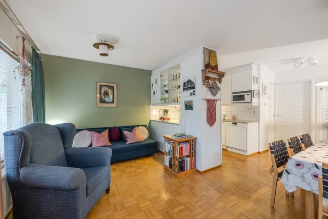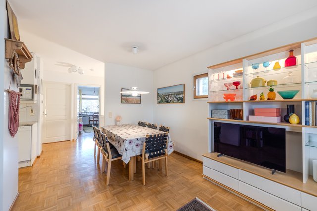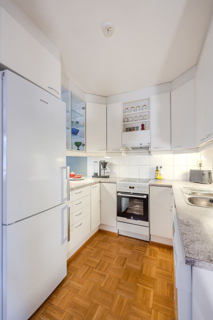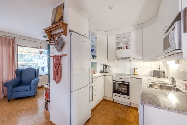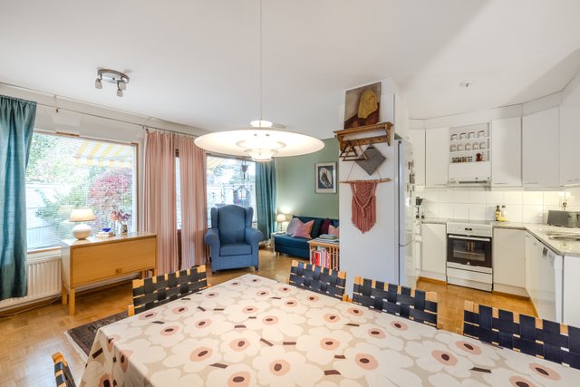 - Kaapistot, jääkaappi / pakastinyhdistelmä, keraaminen liesi, liesituuletin, astianpesukone, seinät välitilalaatta, lattia parkettia.