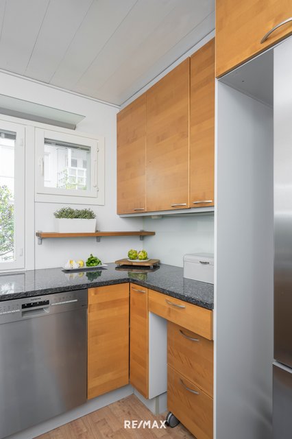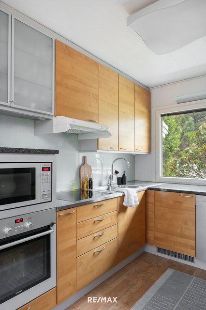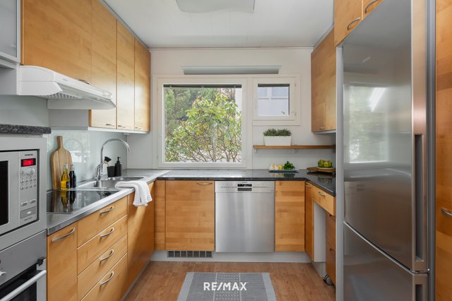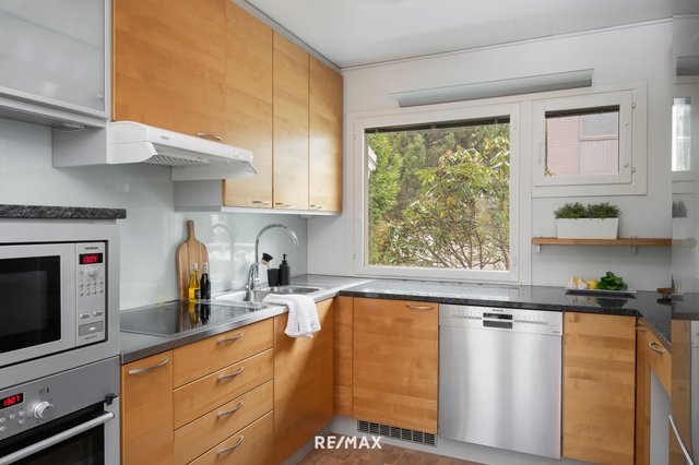 - Tyylikäs keittiö, jossa on mukava laitaa ruokaa, kaikki aina käden ulottuvilla, paljon työtasoa ja säilytystilaa. Ikkuna suuntaa etupihalle. VARUSTEET: Induktioliesi, erillisuuni, mikrouuni, liesituuletin, astianpesukone, jääkaappi/pakastin. VÄLITILA: lasi TYÖTASO: kivi LATTIA: laminaatti SEINÄ: maali