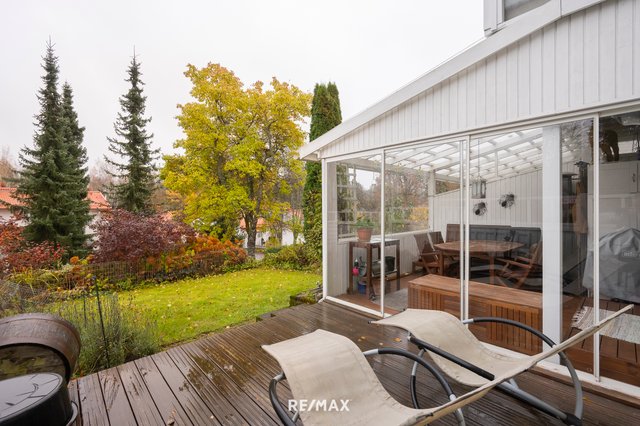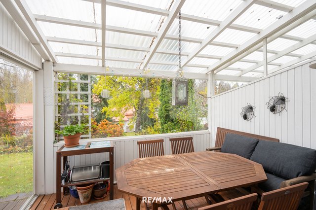 - Lasitettu terassi takapihalla, toimii lisähuoneena, pitkälle syksyyn, pääset vaikka saunan jälkeen vilvoittelemaan.