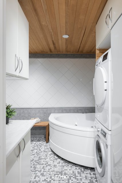 - Pesuhuone sijoittuu alakertaan, samassa tilassa myös kodinhoitopiste. VARUSTEET: suihku, poreamme, työtaso, kaapistot, pesukoneliitäntä. LATTIA: laatta, lattialämmitys SEINÄ: laatta
