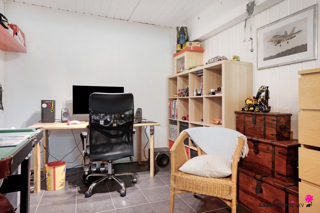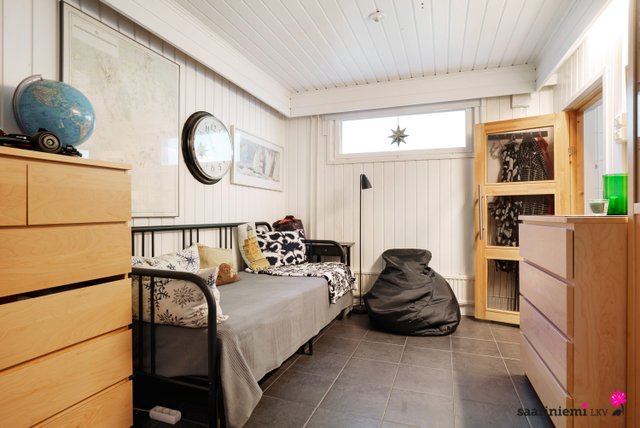 Alakerrassa on yhden makuuhuoneen lisäksi sauna, pesuhuone, tilava pukuhuone sekä kodin toinen wc. Saunassa on heti valmis sähkökiuas, joten saunomaan pääset nopeasti aina kun haluat. Pesuhuoneessa on paikka pesutornille ja pukuhuone tarjoaa paikan tarvittaessa esim. kodinhoitoon tai sukulaisten yöpymiselle. Alakerrassa on lisäksi kaksi varastotilaa (autotalli on muutettu varastoksi) ja vaatehuone tarjoten erinomaiset säilytystilat kodin tarpeisiin.