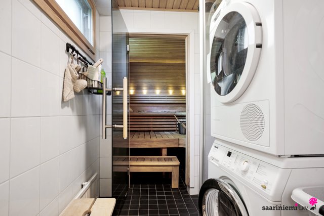 - Yläkerran kylpyhuoneen varustus: wc-istuin, suihku/suihkukaappi, peilikaappi, pesuallas, allaskaappi ja bideesuihku. Alakerran pesuhuoneen varustus: suihku, suihkuseinä, pesukoneliitäntä ja tila pesutornille.