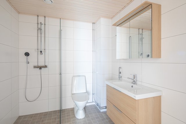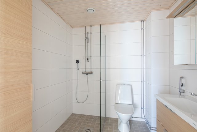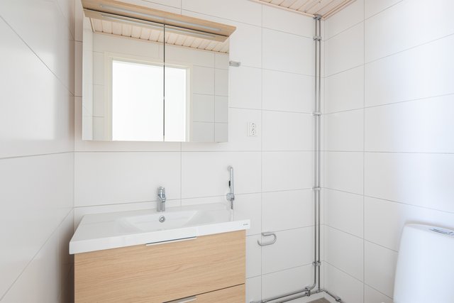 - WC-istuin: Ido Seven D. Suihkusetti: Oras Optima 7149. Allashana: Oras Vega bidettalla. Suihkuseinä kirkas lasi. WC-paperiteline: Abloy Manda, anodisoitu alumiini. Koukusto: Abloy Manda, anodisoitu alumiini. Allaskaappi: 2-laatikkoinen, vaalea tammikuvioitu. Vedin: Lungo, teräs. Pesuallas: valkoinen. Peilikaappi: vaalea tammikuviointi. Katto: vaaleaksi käsitelty kuusipaneeli.