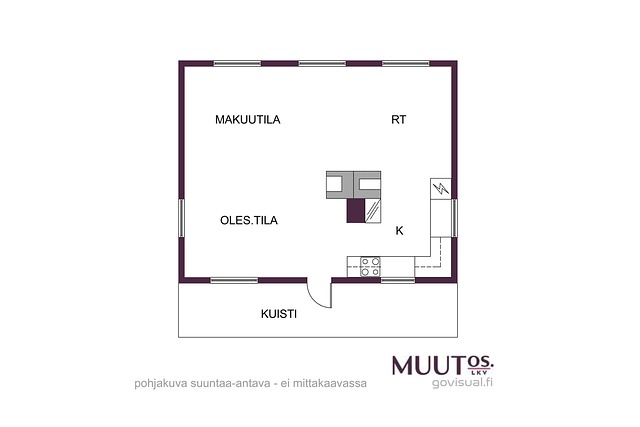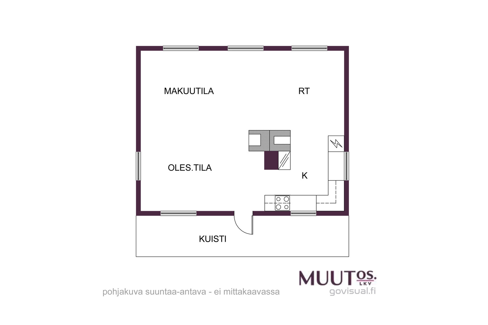 - Rakennusluvan mukainen kerrosala on 63m2. Pinta-alat perustuvat myyjältä saatuihin tietoihin ja rakennuspiirustuksista laskettuihin arvioihin. Pinta-aloja ei ole tarkistusmitattu, mitattaessa pinta-alat saattavat olla ilmoitettua suurempia tai pienempiä. Kohteen kauppahinta ei ole osaksikaan pinta-alaperusteinen vaan perustuu kokonaisuuteen