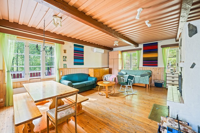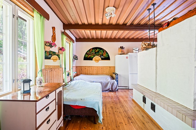 - Ruokailu-, olohuone-, ja makuutilojen yhtenäistä tilaa, joissa lattiat: lauta seinät: puolipaneeli, maalattu