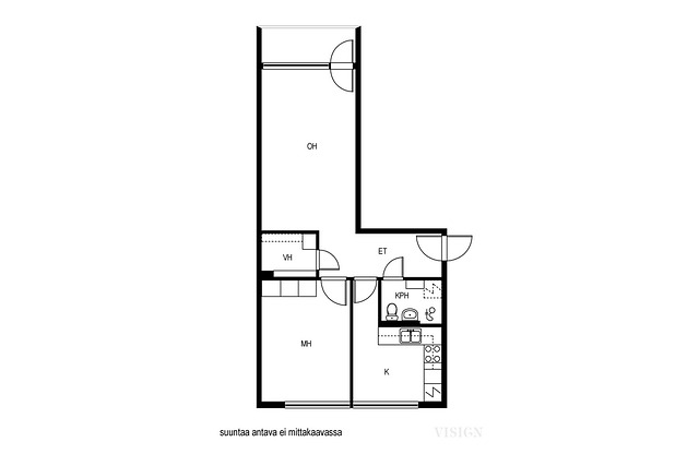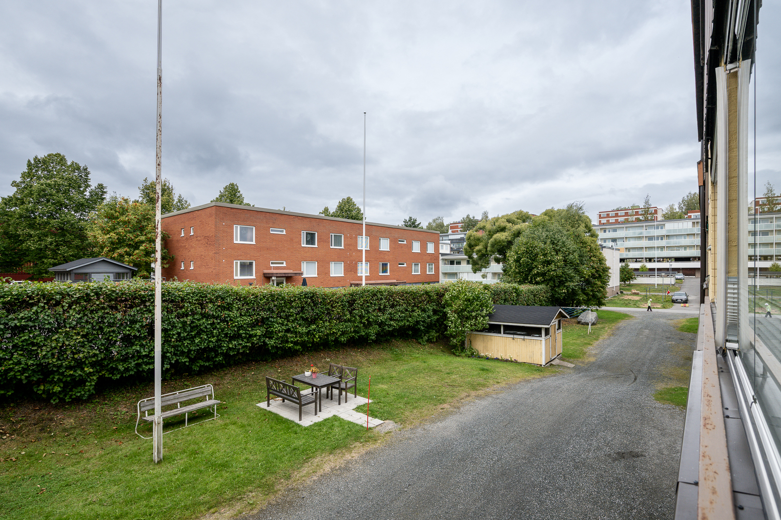 Olohuone on iso ja valoisa, ja sinne mahtuu hyvin isokin oleskeluryhmä. Makuuhuone on tilava ja rauhallinen, ja keittiö tarjoaa toimivat puitteet niin arkeen kuin viikonlopun kokkailuhetkiin. Kylpyhuoneessa on tilaa myös pesukoneelle.