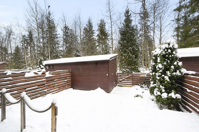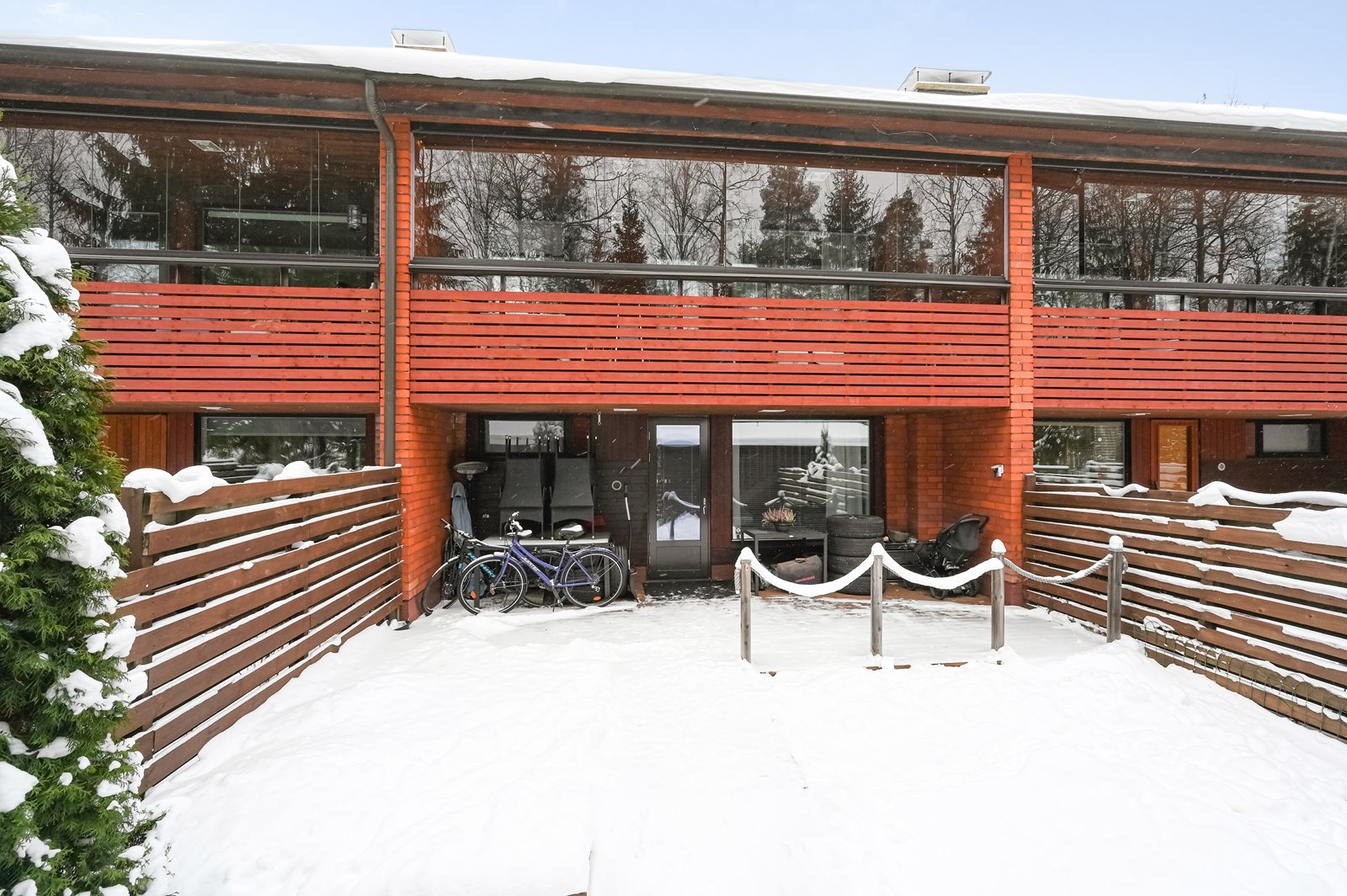 Tämän hyväkuntoisen kauniisti vaalein sävyin sisustetun asunnon ylemmässä kerroksessa sijaitsevat asunnon kaksi hyvänkokoista makuuhuonetta, tyylikäs moderni keittiö, wc ja olohuone. Olohuoneesta on käynti tilavalle lasitetulle parvekkeelle, josta näkymä viereiseen metsään etelä-lounaaseen. Alemmassa sisäänkäyntikerroksessa on asunnon kolmas makuuhuone ja vaalealla tiilisellä avotakalla varustettu takkahuone, sauna ja pesutila sekä toinen erillinen wc sekä kodinhoito- ja vaatehuone. Takkahuoneesta on uloskäynti viihtyisälle terassille ja asunnon suojaisalle piha-alueelle, joka tarjoaa erinomaisen paikan viettää aikaa.