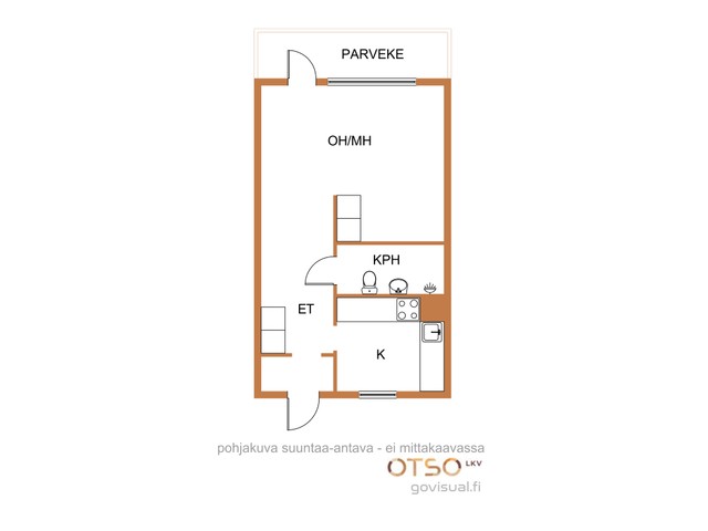 Keittiössä on runsaasti säilytystilaa ja tilaa myös pienelle ruokapöydälle. Pesuhuoneesta löytyvät kaikki tarvittavat varusteet sekä oma paikka pyykkikoneelle. Olohuoneen yhteydessä oleva alkovi tarjoaa luontevan paikan sängylle, ja oleskelutila jää silti avaraksi ja monikäyttöiseksi. Parveke avautuu sisäpihalle.