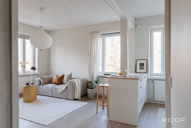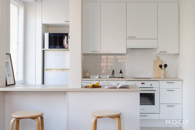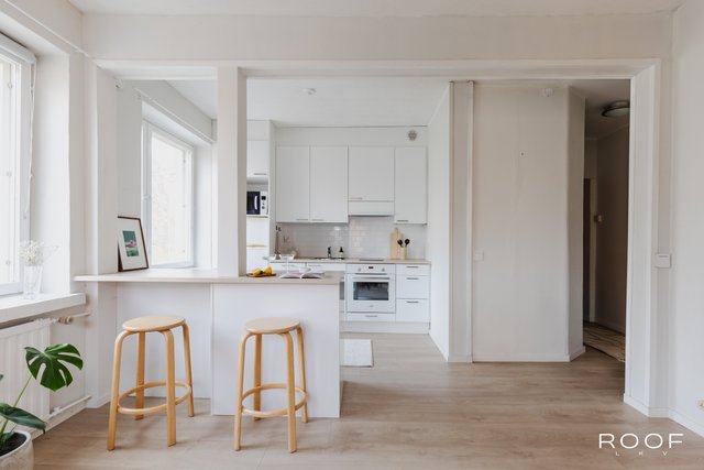 Tässä kodissa on jotain, mikä heti tuntuu omalta. Tunnelmallinen miljöö, valon määrä ja tilan selkeys luovat viihtyisän tunnelman. Näkymät ovat vehreään Kalevanpuistoon, jossa näkyy syksyllä puiden väriloisto, ja talvella ensilumen värjäämät puunoksat. Asunnon keittiö on kauniisti remontoitu ja nykyaikainen. Saareke tuo lisää säilytys- ja työskentelytilaa, kokonaisuus liittyy luontevasti olohuoneeseen, jossa arki soljuu mukavasti.