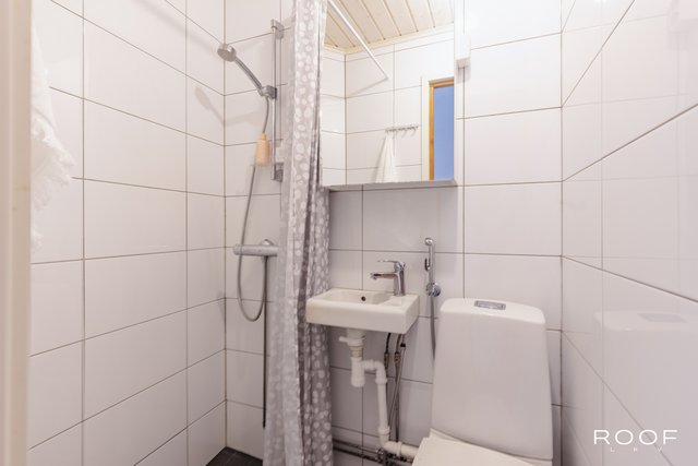 - WC-istuin, suihku, pesukoneliitäntä, lattialämmitys, peili, pesuallas, ja bidee-suihku