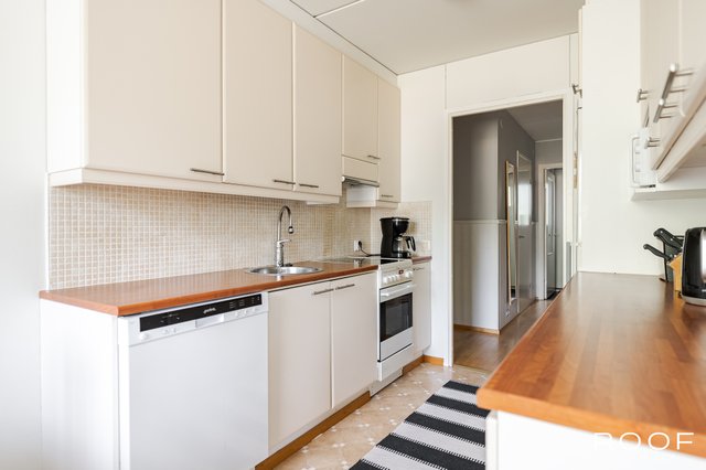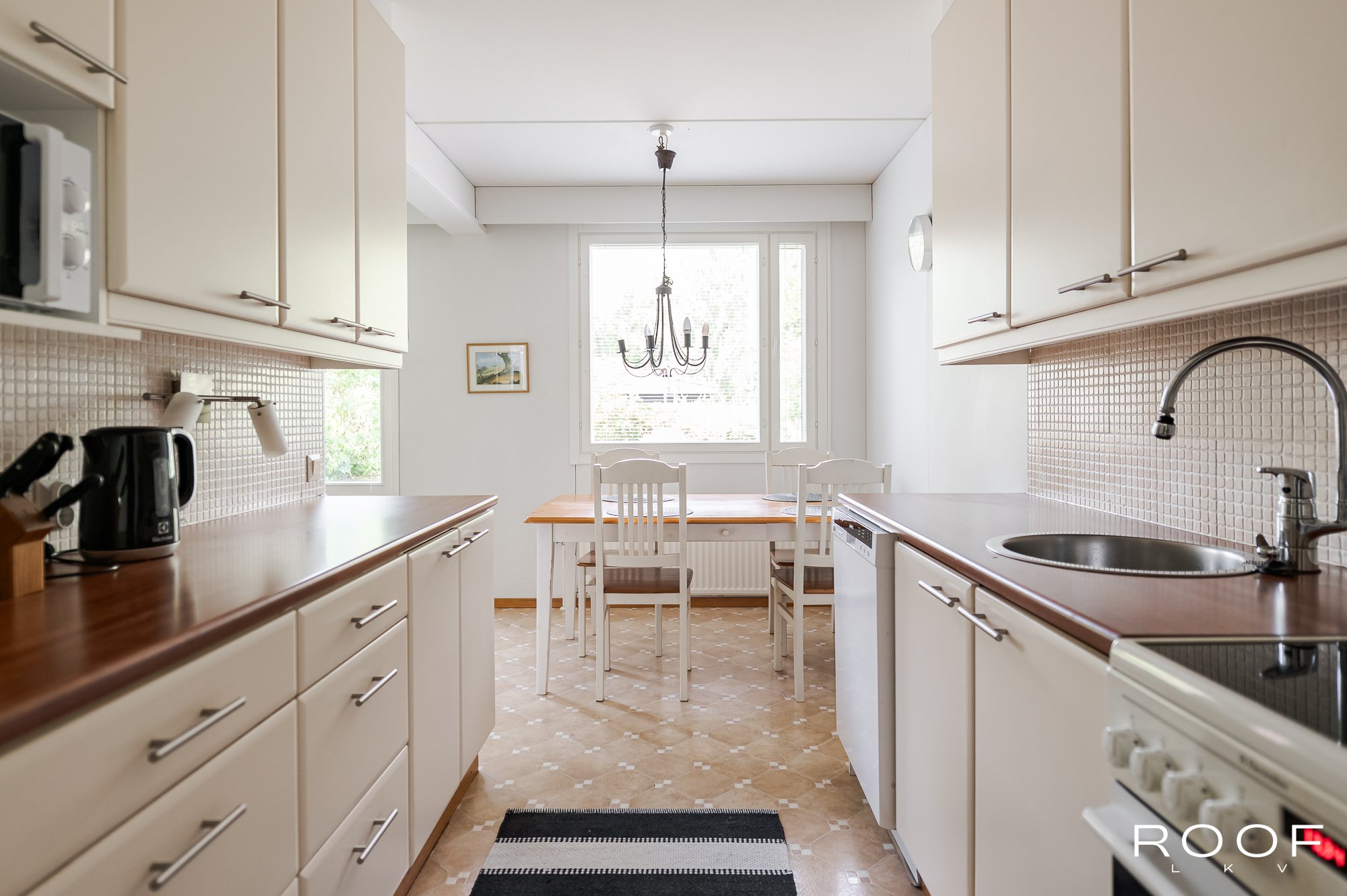 - Keittiössä paljon kaappi- ja laskutilaa. Keittiöön mahtuu lapsiperheen ruokailuryhmä. Varustus: liesi, uuni, liesituuletin, astianpesukone, jääkaappi/pakastin.