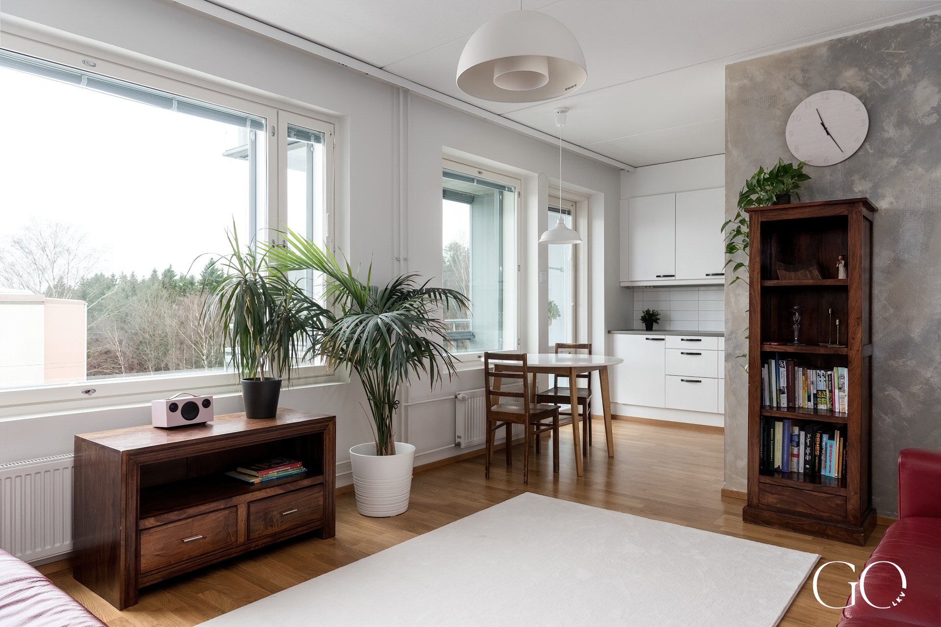 - Avarassa olohuoneessa on maalatut seinät ja parkettilattia.