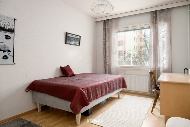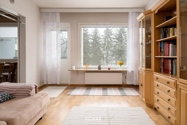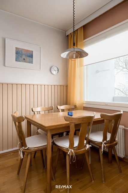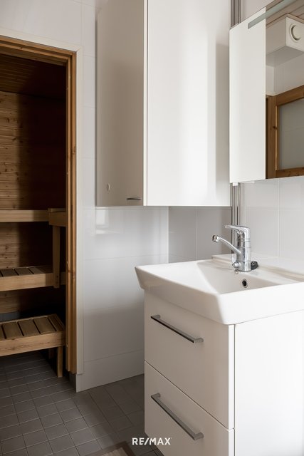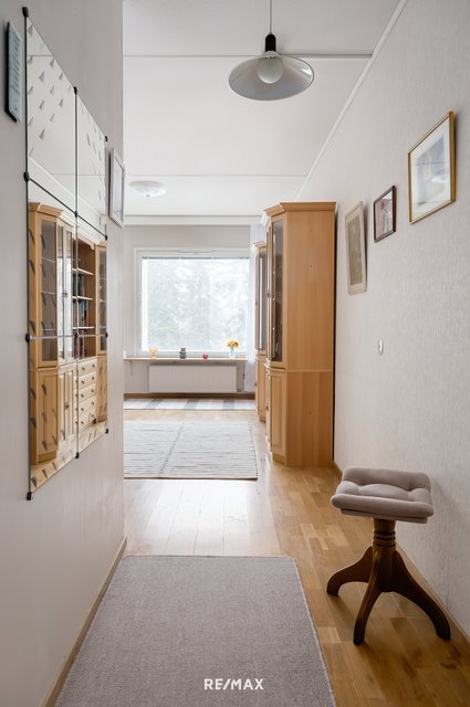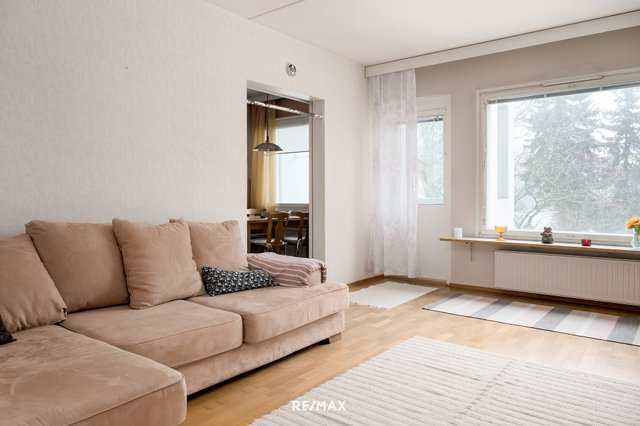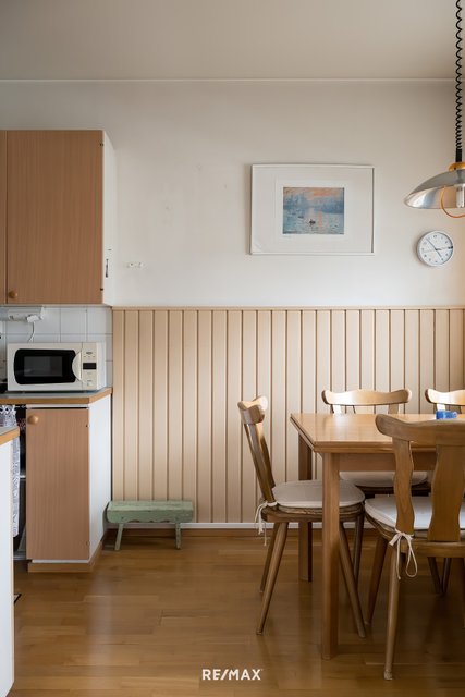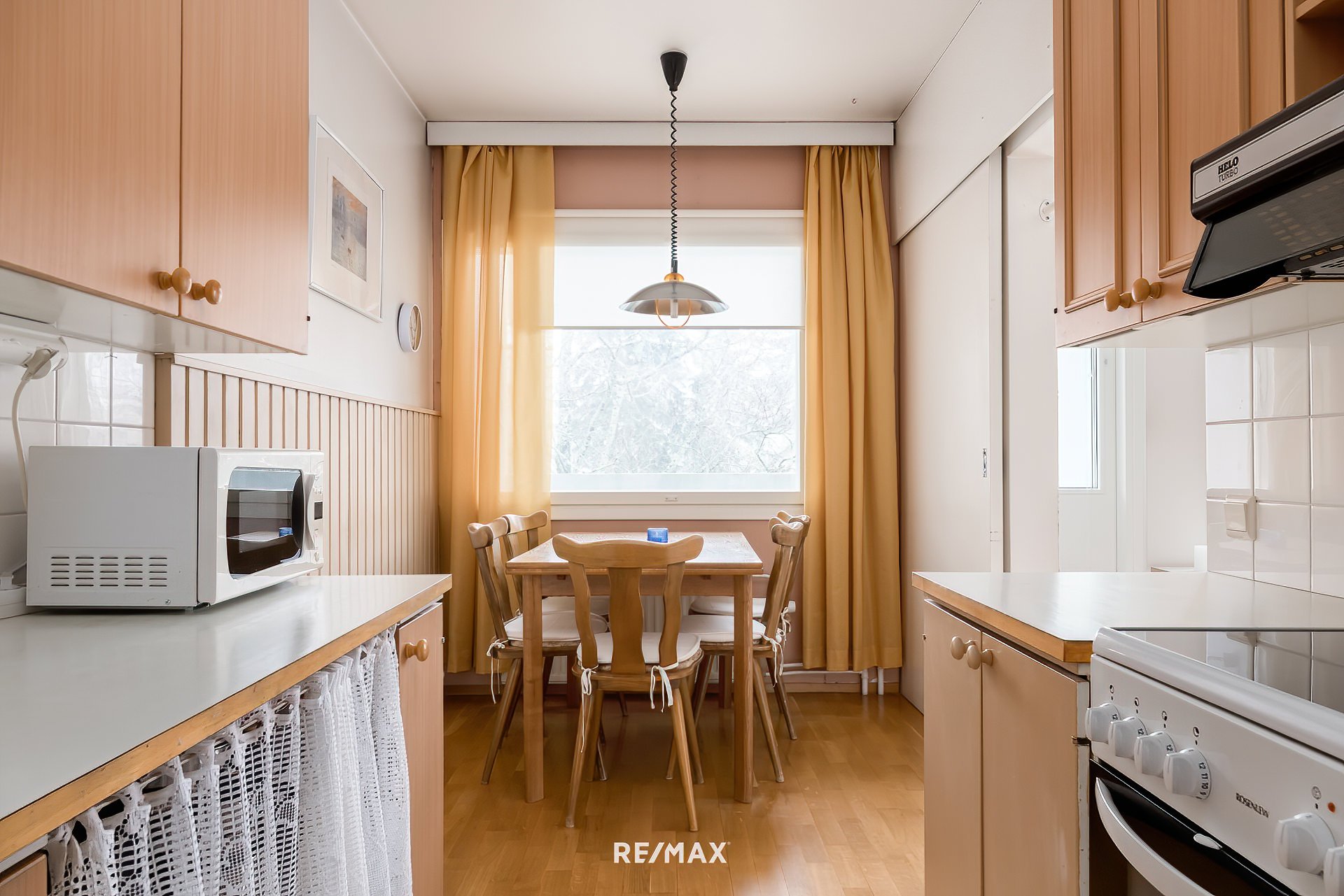 Keittiö on yksinkertaisen toimiva kokonaisuus, jossa kaikki arjen toiminnot ovat helposti käden ulottuvilla. Ruokailuryhmälle on luonteva paikka ikkunan äärellä ja olohuoneen ikkunan alle mahtuu tarvittaessa myös suurempi ruokapöytä. Tilava olohuone toimii luontevasti asunnon sydämenä, jossa on helppo viettää aikaa niin arjessa kuin vieraidenkin kanssa. Linjasaneerauksen yhteydessä remontoitu kylpyhuone on moderni ja käytännöllinen. Arjen mukavuutta lisää oma sauna, joka tuo asumiseen ripauksen lisäluksusta ja rentoutumisen mahdollisuuden omassa rauhassa.