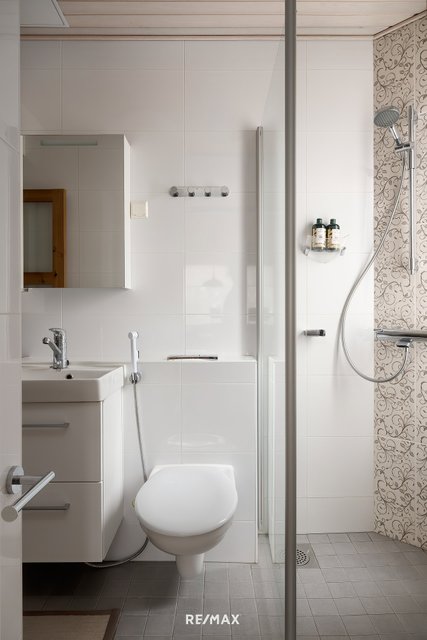 - WC-istuin, suihku, suihkuseinä, pesukoneliitäntä, peilikaappi, pesuallas, allaskaappi, ja bidee-suihku