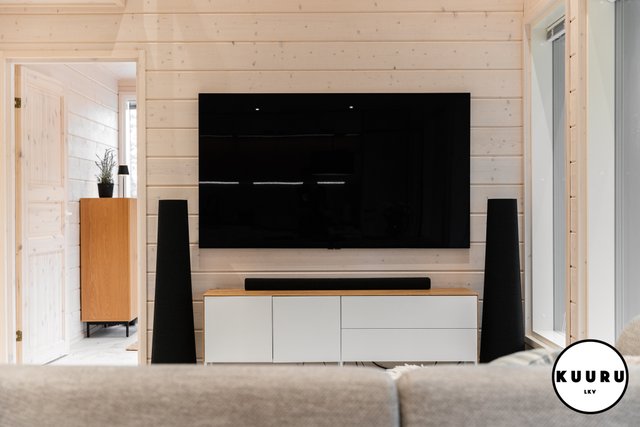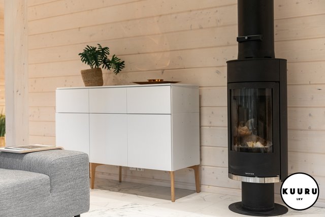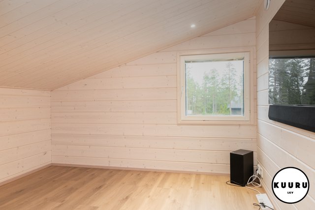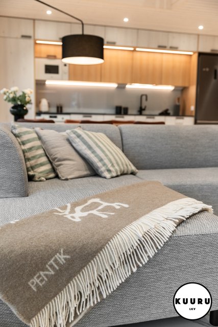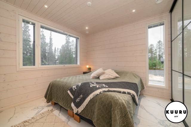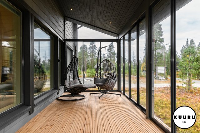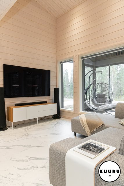 Jo sisään astuessa huomaa tilojen avaruuden ja valon määrän. Suuret ikkunat kehystävät kauniit tunturimaisemat ja tuovat luonnon osaksi sisustusta. Korkea huonekorkeus korostaa tilan arvokkuutta ja luo huvilaan ilmavan, levollisen tunnelman. Vaaleat sävyt ja marmoria muistuttava laattalattia tuovat kokonaisuuteen hienostuneen sävyn, jossa pohjoisen luonnon rauha ja moderni design kohtaavat sulavasti. Iso lasitettu parveke mahdollistaa ulkoilmasta ja aamukahveista nauttimisen säältä suojassa huonommallakin kelillä.
