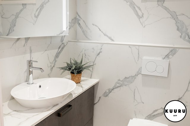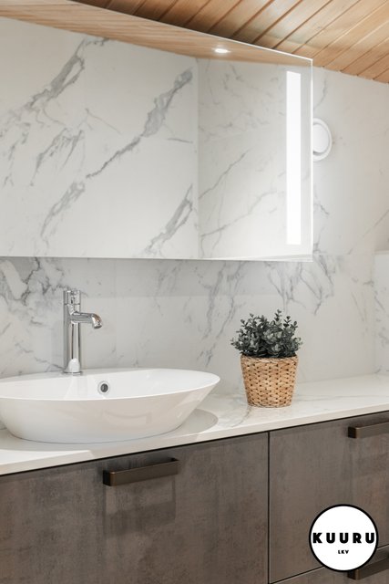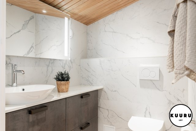- Valoisa ja raikas wc, jossa marmoria mukailevat pinnat ja lämminsävyinen puukatto luovat ylellisen hotellitunnelman. Pehmeä valaistus ja selkeälinjainen kalustus tekevät tilasta viimeistellyn ja helppohoitoisen. Arkea helpottaa, että tällaisia wc-tiloja on loma-asunnossa yhteensä kolme kappaletta: kaksi alakerrassa ja yksi yläkerrassa. Käytännöllistä mukavuutta isommallakin porukalla lomaillessa.
