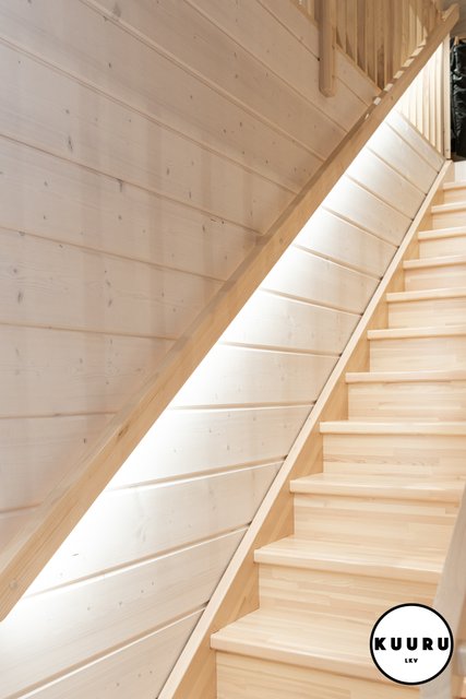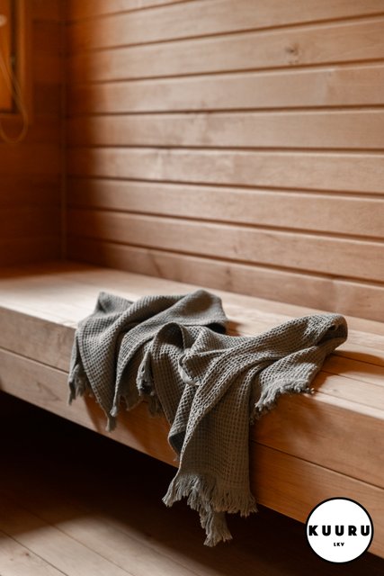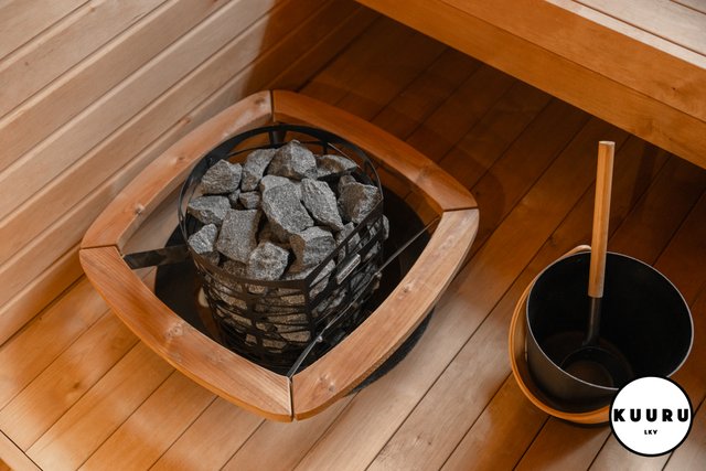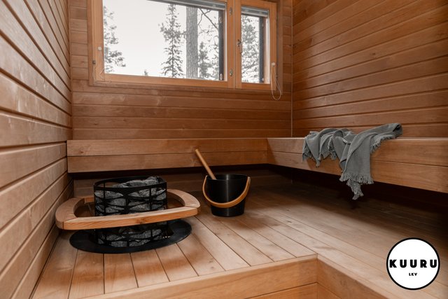- Saunassa on lempeän lämmin tunnelma: puupinnat ja epäsuora valaistus rauhoittavat heti sisään tultaessa. Uljas pylväskiuas antaa pehmeät ja pitkät löylyt, ja runsas kivimäärä varaa lämpöä tasaisesti. Ikkunasta avautuva metsäinen näkymä viimeistelee rauhoittavan hetken. Väljä lauderatkaisu tekee oleskelusta mukavaa – tänne on helppo istahtaa niin arjen pikasaunalle kuin viikonlopun hemmotteluhetkeen.