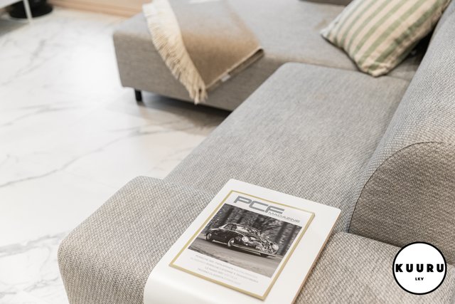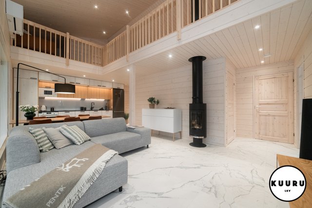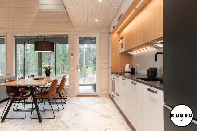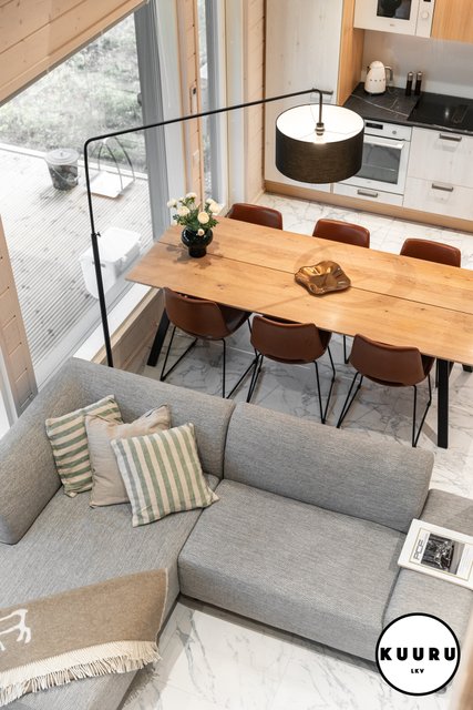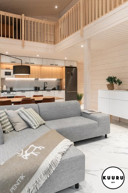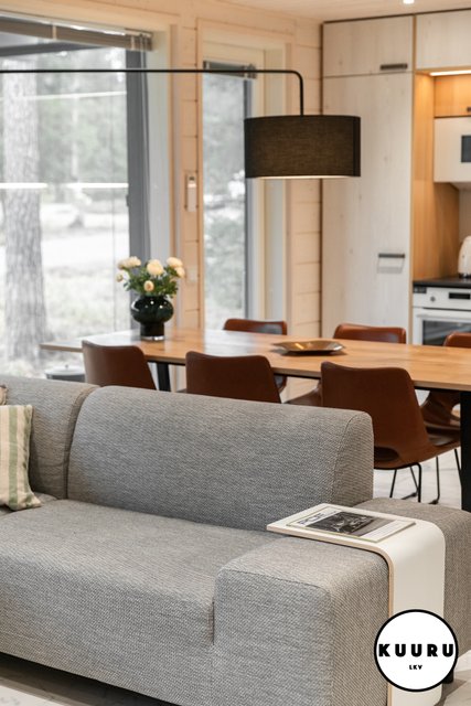 - Olohuone kylpee valossa suurten ikkunoiden ja vaikuttavan huonekorkeuden ansiosta. Vaaleat sävyt ja marmoria mukaileva laattalattia henkivät hienovaraista ylellisyyttä. Kalusteille on reilusti tilaa ja kulku säilyy selkeänä – metsään avautuvat näkymät viimeistelevät levollisen tunnelman. Näissä tiloissa on helppo viihtyä ja nauttia lomailusta niin perheen kuin ystävienkin kesken. Lisää oleskelutilaa löytyy yläkerran aulasta, jossa on mukavasti tilaa esimerkiksi nuoremmille lomailijoille.