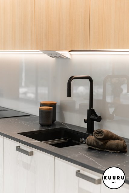 - Tyylikäs ja rauhallinen Puustellin keittiö toimii kodin sydämenä: vaalea puu ja tummat yksityiskohdat luovat hienostuneen ilmeen. Pehmeä kaapistovalaistus ja viimeistellyt pinnat tuovat ripauksen ylellisyyttä arkeen. Pitkä työskentelytaso ja runsaat kaapistot tarjoavat reilusti työskentelytilaa ja säilytystilaa ilman ahtauden tunnetta. Marmoria muistuttava lattia viimeistelee kokonaisuuden.