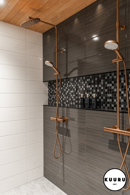 - Kylpyhuoneen lämmin värimaailma ja harjatun metallin säihke luovat rauhoittavan spa-tunnelman. Kaksi sadesuihkua kutsuu pitkään ja virkistävään pesuhetkeen – kiireettömät aamut ja iltojen saunahetket sujuvat omassa tahdissa. Seinän hyllysyvennys pitää suosikkituotteet kauniisti esillä ja tilan aina huoliteltuna. Lasioven takana sauna odottaa pehmeine löylyineen, ja ikkunasta siivilöityvä luonnonvalo viimeistelee ylellisen hetken.