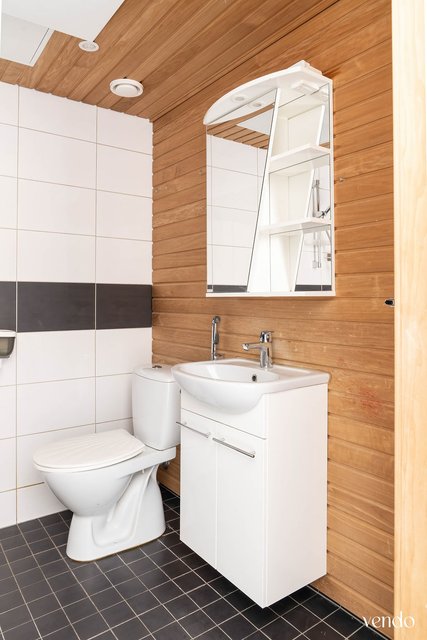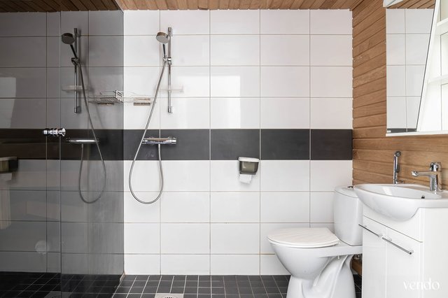 - WC-istuin, suihku, pesukoneliitäntä, allaskaappi, ja peilikaappi