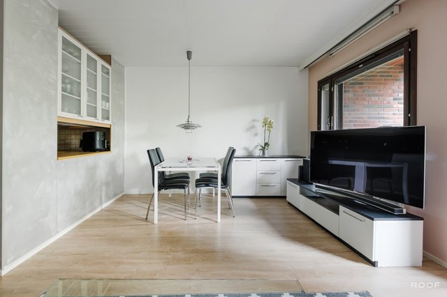 - Käynti lasitetulle parvekkeelle. Laminaatin alla parketti. Lattia: laminaatti. Seinät: tapetti.